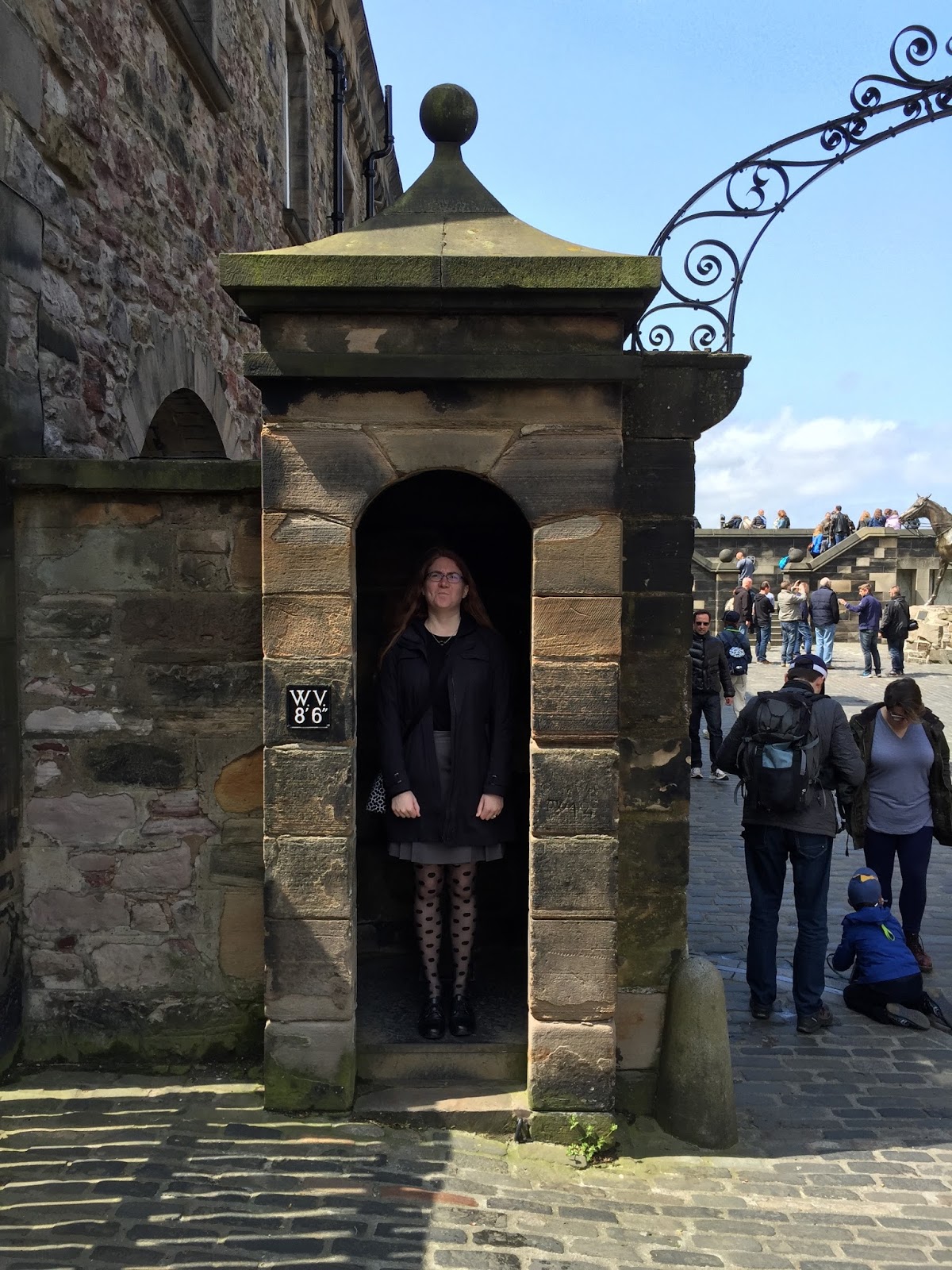 Laura at Starbucks, Edinburgh Castle on the hill in the background.